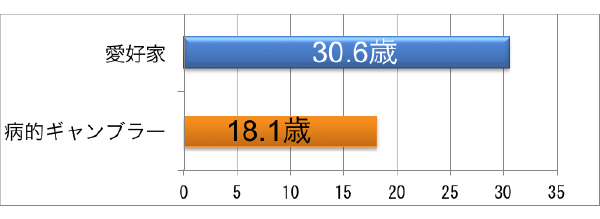 まず、ギャンブルの開始年齢の平均値である。ご覧の通り歴然とした差があり、ギャンブルを早く始めればそれだけ依存症のリスクが高まることが示唆された(※グラフ1)。確かに周囲のギャンブル依存症の仲間達も、殆どがギャンブルを10代で始めたと言っており、現在、公営ギャンブルの解禁年齢が20歳であるのに対して、パチンコだけが18歳で解禁となっている点も再考の必要があるのでは?と考えた。