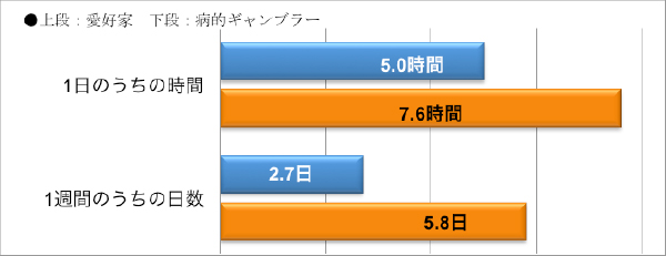 と、こちらも大きな差となった。ギャンブル愛好家(青)よりも依存症者(オレンジ)の方がはるかに多い時間と日数を費やしている。
