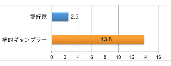 また、両者にSOGSに答えて貰うと、5点以上がギャンブル依存症者と示唆される所、以下のような結果となり、この対照群が明らかに愛好家群とギャンブル依存症者に弁別されていることがわかった。