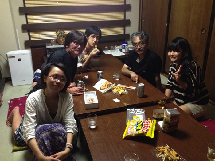 ▲写真 活動の拠点となった相馬市・星槎寮にて。医療者や教員など支援者が集まり、現場の意見交換や将来について夜通し語り合う場だった。左端より筆者、尾崎達也氏(星槎国際高校)、石井武彰医師(九州大学附属病院、相馬中央病院)、加藤繁明氏、樋口朝霞氏(北海道大学看護学生)(2013年8月撮影、所属は当時。著者提供)