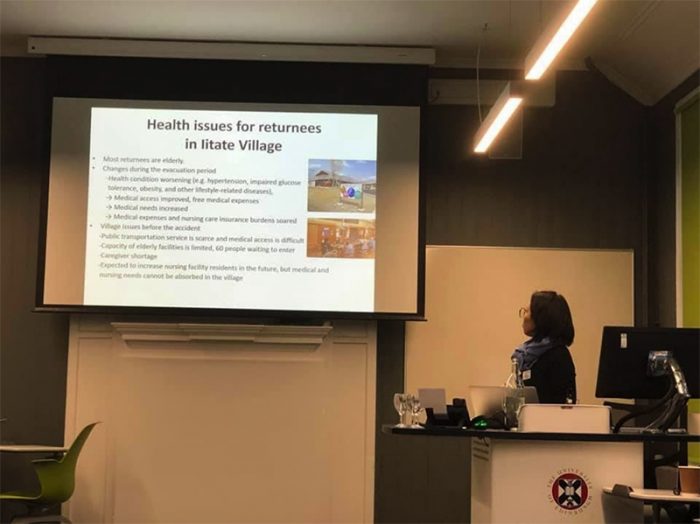 また、放射能汚染による避難指示が出された自治体では、順々に避難指示が解除されつつある。しかし、中長期の避難を経ての帰還は、生活・社会環境の変化、地域の高齢化・過疎化、医療アクセスの悪化など、対応すべき健康課題もより多く存在する。これら避難指示解除後の保健課題を、先日、スコットランド・エジンバラ大学の減災シンポジウムで発表した。その一部を紹介したい。