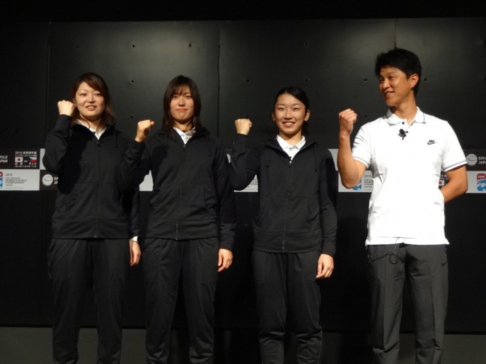*(記事トップ写真)10月23日 芝浦で行われた記者会見の模様。ガッツポーズも凛々しく。左から、久保、鈴木世奈(DF),床、藤澤新監督。