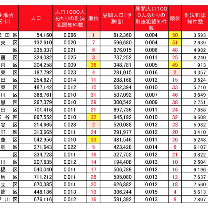 ※トップ画像参照/東京都昼間人口の予測−統計データ− 平成27年3月をもとに筆者がデータを作成(出典:警視庁HP「東京都の自治体別刑法犯発生状況」の犯罪発生状況一覧表/平成22年~26年)