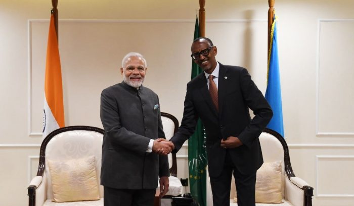 写真)ルワンダを訪問したナレンドラ・モディ インド首相(左)と ポール・カガメ ルワンダ大統領(右)(2018年7月24日)