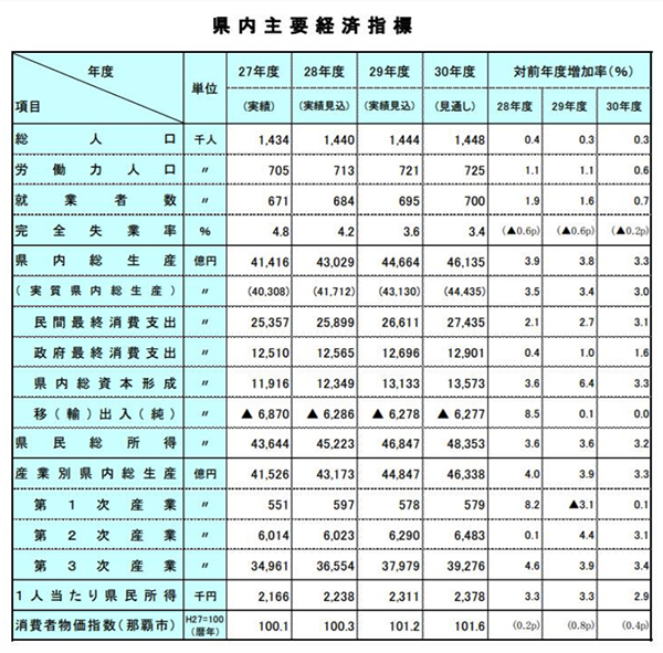 ▲沖縄県内主要経済指標 出典:沖縄県HP「平成30年沖縄県内経済の見通し」