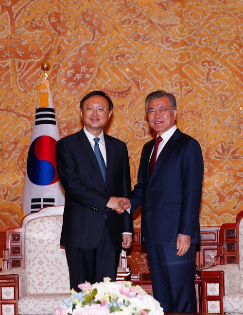 写真)韓国文在寅大統領とソウルで会談する楊潔篪(ヨウケッチ)中国国務委員 2018年3月30日