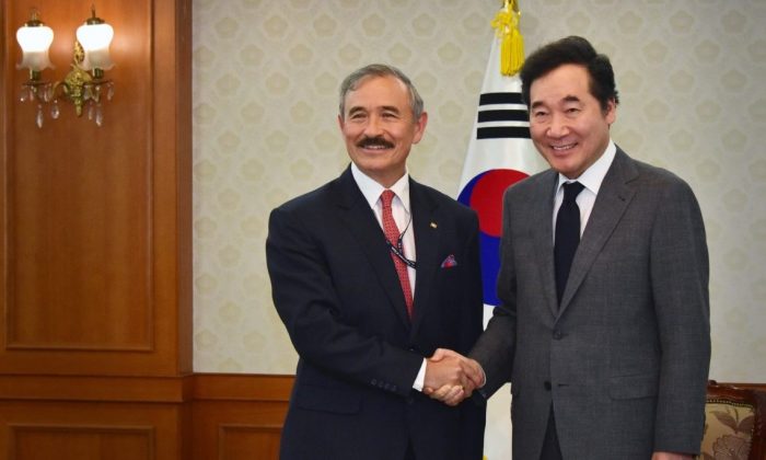 写真)ハリス駐韓米国大使と会談する韓国李洛淵(イ・ナギョン)首相
