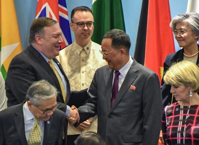 写真)北朝鮮の李容浩(リ・ヨンホ)外相に挨拶するポンペオ米国務長官 2018年8月4日