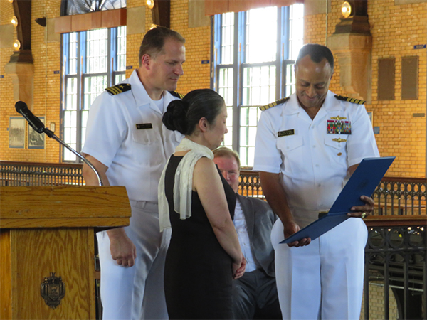 ▲写真 退役式でリーズン大佐から感謝状を受け取るテデッソ中佐(左)真ん中の女性は桂子夫人 ©古森義久