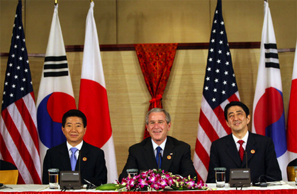 ▲写真 2006年11月、ハノイで三者協議を行うブッシュ大統領、安倍首相、盧武鉉大統領 出典:The White House photo by Eric Draper