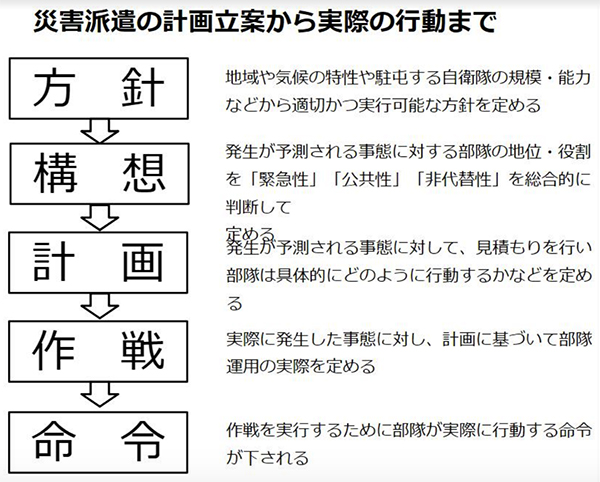 自衛隊は事前の準備なくして直ちに行動することはできない。これは組織が大所帯であることと、防衛組織の独断専行はクーデターとされかねないためである。「準備」とは主に調整、計画立案、訓練のことで、平時のうちに災害派遣担当地域の地域見積もりや自治体との関係、部隊の規模、能力などから自衛隊災害派遣の3原則に基づいて災害派遣部隊の地位、役割を決める。以降、部隊が実際に行動できるようになるためには、下図「災害派遣の計画立案から実際の行動まで」にある手順を踏むことになる。