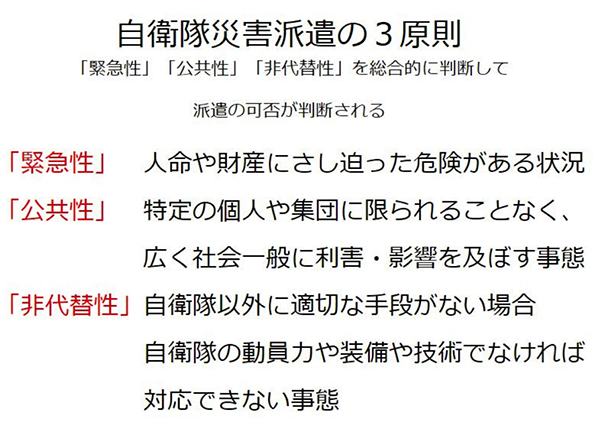 自衛隊は本来、国土侵略に備える防衛組織であり、防衛出動、治安出動に即応する専門機関である。災害派遣は防衛に支障を来さない範囲で行うものであるから、自然災害の発災後に直ちに出動するためには、相当な準備が必要となる。