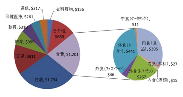 ▲図 シンガポールの月額世帯支出の内訳 出典:日本貿易振興機構(ジェトロ) 「シンガポールにおける日本食レストランの出店状況及び日本食材の流通状況調査」