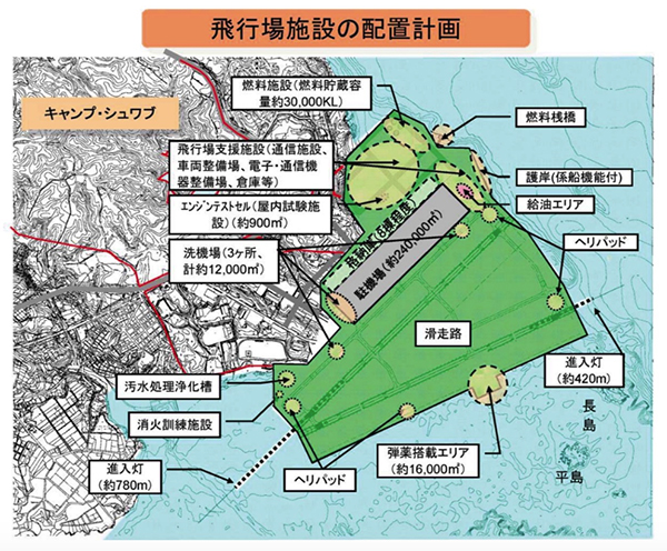「仮に長さ二百六十メートルの強襲揚陸艦を運用する場合、現在計画中の護岸の総延長約二百七十メートル全てに係船機能があるとしても、長さは不十分であります。当該岸壁は、強襲揚陸艦の運用を前提とした設計とはなっておりません。」(原田憲治防衛大臣政務官、2015年3月10日衆議院予算委員会第三分科会)