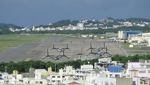 ▲写真 普天間飛行場に並ぶオスプレイMV-22(FIJ・立岩陽一郎理事撮影、2018年9月21日)