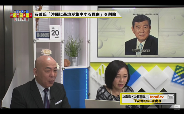 (百田尚樹氏)石破さんが削除された動画ね、見てませんけれど記事によると内容ね、日米両政府が本土の反対運動を懸念し、沖縄に移転させた、基地をね。そんな事実どこにもないっていうねん。沖縄っていうのは昭和47年までアメリカの土地やってんで、全部。… (9月20日放送「虎ノ門ニュース」)