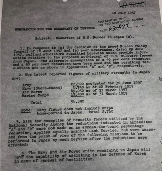 ここに、「在日米軍の削減」と題された米国防長官のための覚書(1957年7月10日付)がある。それによると、1957年時点で日本本土に展開していた在日米軍兵力は計9万8890人で、海兵隊も1万3400人いた。この覚書は40〜50%の兵力削減に言及していた。