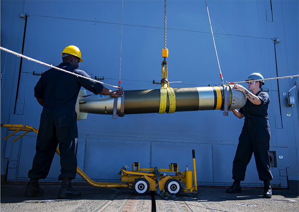 ▲写真 Mk46短魚雷、キャプターの中身としても用いられた。対潜水艦用であり直径32センチ、2.5m、200kg超と小ぶりである。水上艦船には命中しないように設定されており実際にフォークランド紛争でアルゼンチン浮上潜水艦に発射したところ船底を素通りした。 出典:U.S. Navy Public Domain (photo by Justin R. Pacheco)