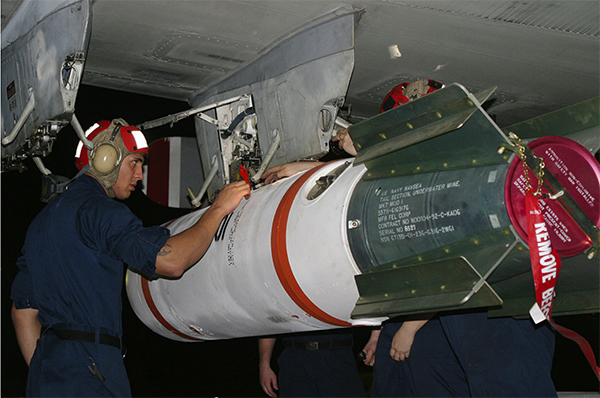 ▲写真 クイックストライク機雷。P-3Cにクイックストライク魚雷MK-65を装備する兵士。(沖縄 2005年2月17日)米機雷は多様性を欠いている。キャプターや潜水艦から軍港を狙う自走式機雷SLMMは廃止された。残る近代的機雷は写真のクイックストライク系航空機雷だけとなっている。海底に沈む沈底式のため大水深には使えない。 出典:U.S. Navy Public Domain(photo by Photographer’s Mate 3rd Class Shannon R. Smith)