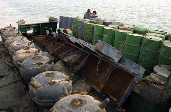 ▲写真 繋維(けいい)機雷。宮古海峡封鎖のような防勢的機雷原では繋維触発機雷が復活する可能性もある。極めて安価であり動作は確実、肥料水準の水雷用火薬さえあれば町工場でも大量生産可能だからだ。写真はドラム缶の下に隠されたイラク製LUGM-145。中身は帝政ロシア1908年式と大差はない。 出典:U.S. Navy Public Domain(Photo by Richard Moore)