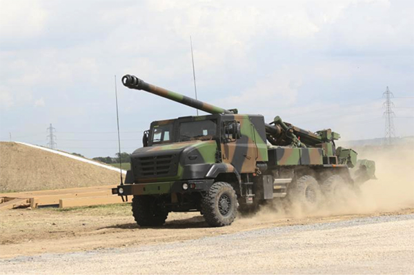 ▲写真 南アフリカ、デネル社のT-5。射撃時の安定を確保するために車体横に駐鋤(ちゅうじょ)を装備している。出典:著者撮影