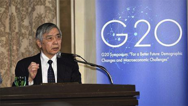 ▲写真 日本銀行・財務省共催G20シンポジウムで基調演説する黒田東彦 日銀総裁(2019年1月17日)出典:日銀facebook