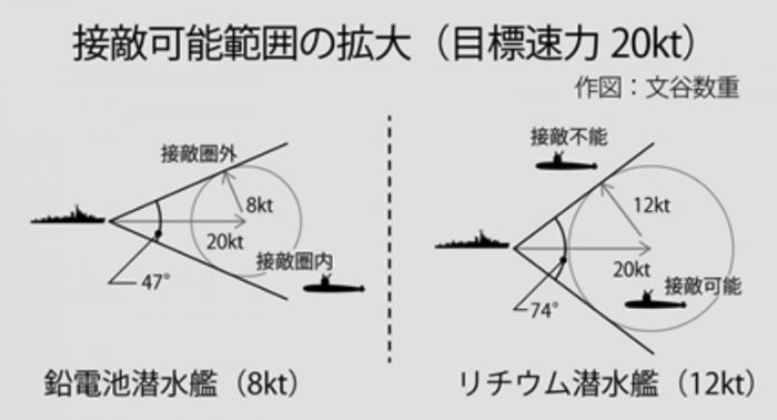 そのため接敵・攻撃のチャンスは少ない。8ktの潜水艦は20ktで走る軍艦の針路前方47°の範囲にいない限り接敵できない。それがリチウム化で大幅改善する。水中速力12ktあるいはそれ以上も差し支えはないのだ。それにより攻撃圏は20ktの軍艦の前方74°以上に広がるのである。