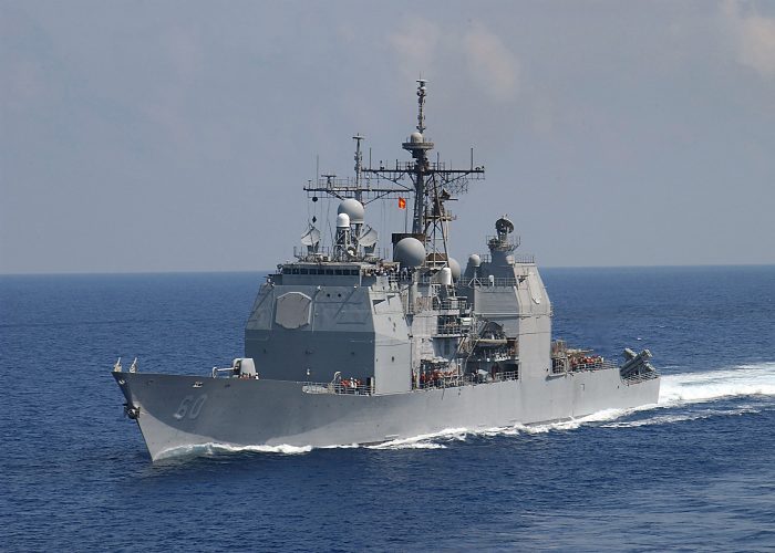 写真)米巡洋艦ノルマンディ〈米軍艦はミサイル艇を返り討ちにしている。写真はUSSノルマンディ。86年のシドラ湾事件で先制攻撃したUSSヨークタウンの同型艦である。〉