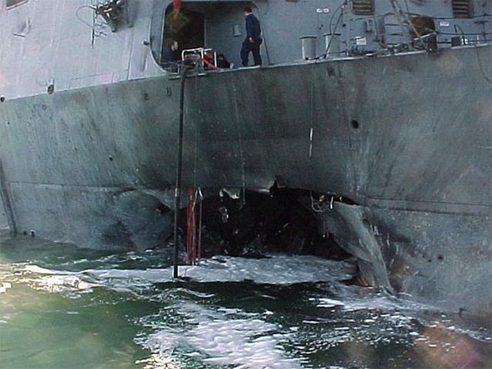 ▲写真 自爆テロに攻撃されたUSS Coleの船腹 出典:US Navy