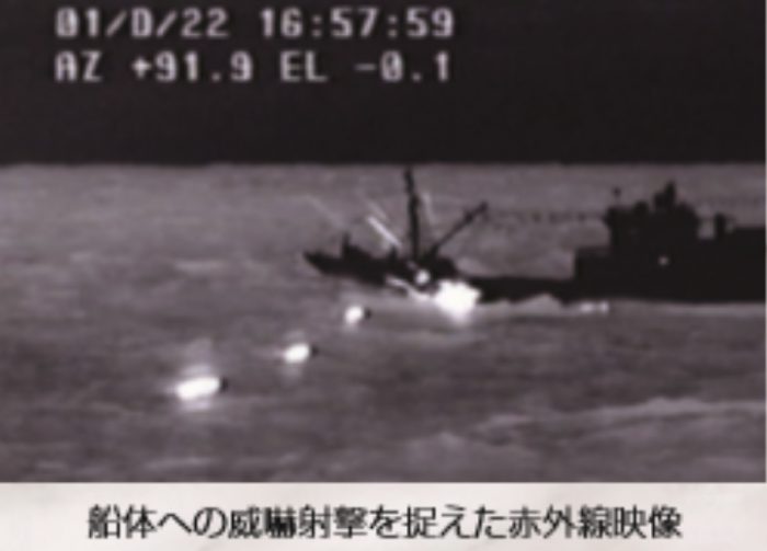▲画像 海保巡視船による不審船(北朝鮮工作船)船体への威嚇射撃(2001年12月22日)出典:海上保安庁ホームページ