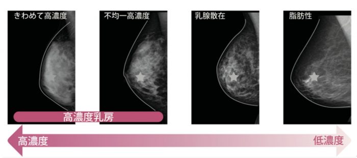 ▲写真 乳腺濃度は,乳腺と脂肪の割合や分布によって,『極めて高濃度』,『不均一高濃度』,『乳腺散在』,『脂肪性』の4つに分類されている。前者2つ、図の左2つを高濃度乳房と呼ぶ。 出典 埼玉乳がん検診検討会