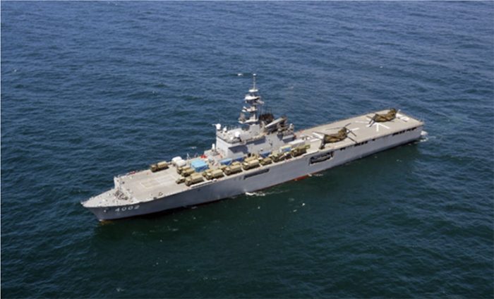 ▲写真 自衛隊は国際緊急援助隊の派遣準備体制を維持している。常に「おおすみ」型輸送艦の1隻は指定されており即時対応可能となっている。写真は「しもきた」。出典 : 海自ホームページ「装備品 輸送艦『おおすみ』型」