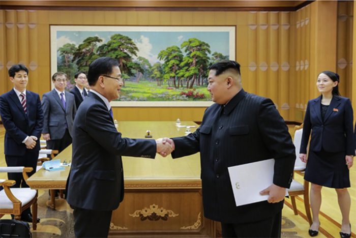 ▲写真 韓国特使と会談する金正恩委委員長。後ろに金与正氏の姿も(2018年3月6日 北朝鮮・平壌)出典:韓国大統領府ホームページ