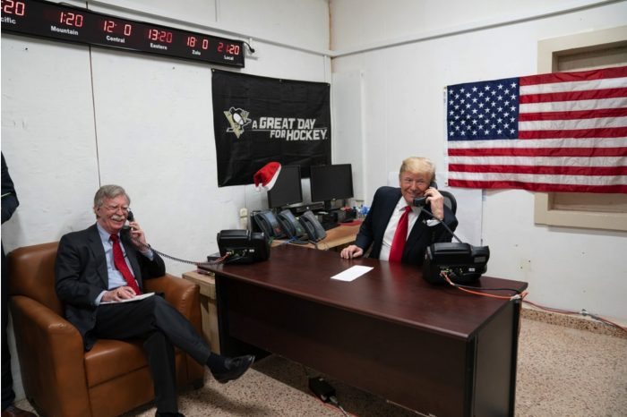 ▲写真 イラク駐留米軍部隊へのクリスマス慰労訪問のため、アル・アサード航空基地へ向かう大統領専用機内でイラクのアブドル・マハディ首相と電話するトランプ大統領とボルトン大統領補佐官(2018年12月26日)出典:The White House[Public domain]
