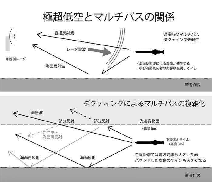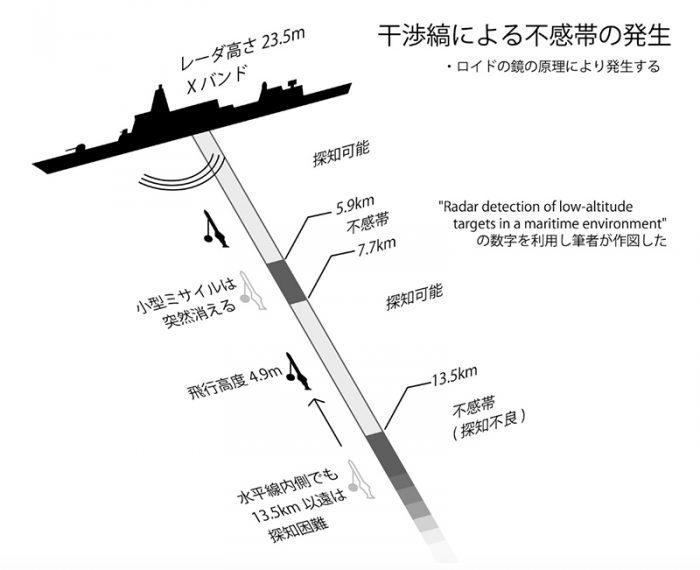 極超低空においてレーダは探知不良の距離帯を持つ。ミサイル反射波と海面反射波が位相干渉を起こす結果だ。