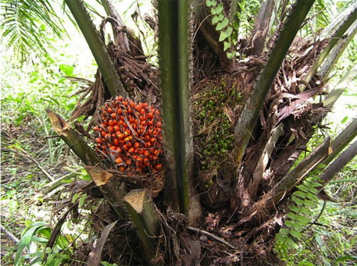 ▲写真 アブラヤシの幹と実 出典:Wikimedia Commons; Bongoman