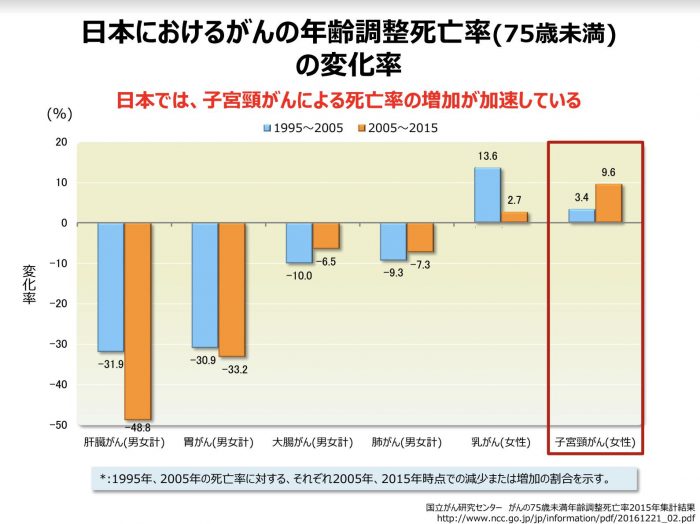 HPVワクチンは2013年に定期接種化されたものの、2013年6月14日に積極的接種勧奨が差し控えとなった。厚生労働省の直近の報告によれば、子宮頸がんワクチンの定期の予防接種率は0.3%である。この間、子宮頸がんの罹患率は上昇、子育て世代、働き盛りである20代から40代をピークに年間3000人弱の女性の尊い命が奪われている。毎日8人がこの子宮頸がんで亡くなっている。現在治療を受けている患者は1万人にのぼる。