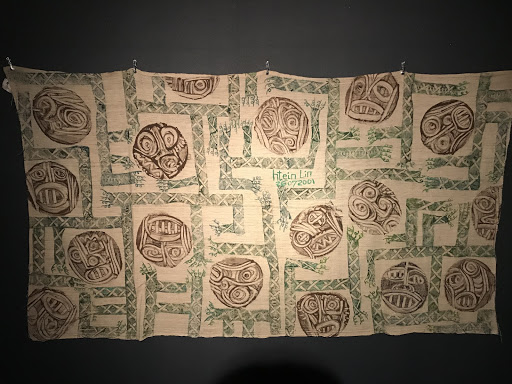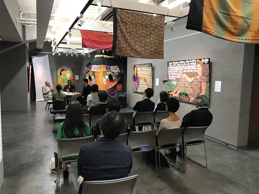 また、会場には女性用ロンジーが吊るされて展示されていた。ミャンマーでは、女性用ロンジーが吊るされている下に座る人は誰もいないという。このように、ティン・リン氏の男女差別に対する思いや訴えが、彼の作品だけでなく会場にも込められていた。