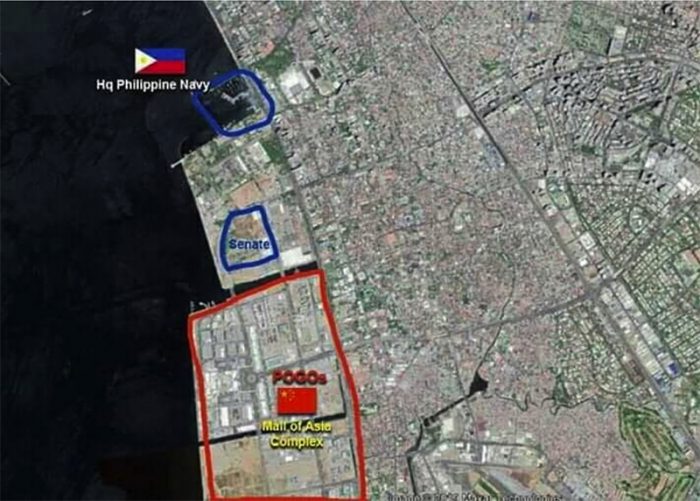 ▲写真 POGO(赤い線で囲まれた所)、フィリピン海軍基地(青い線で囲まれた所:一番上)、議会(青い線で囲まれた所:真ん中)出典:Philippines Defense Forces Forum Facebook