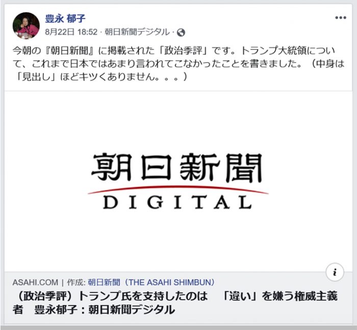 今回の記事はオピニオン面の下段、「政治季評」というコラム欄に載った「トランプ氏を支持したのは『違い』を嫌う権威主義者」という見出しの論文だった。筆者は早稲田大学教授の政治学者、豊永郁子氏だった。豊永氏はときおり朝日新聞に登場して、安倍政権やその官僚をナチス・ドイツに重ねて叩く論法を展開した実績がある。