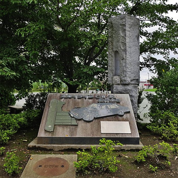 ▲写真 日産村山工場跡地のプリンスの丘公園に建つ「スカイラインGT-R発祥の地」の碑(2017年8月20日)出典: Wikimedia Commons; Qurren