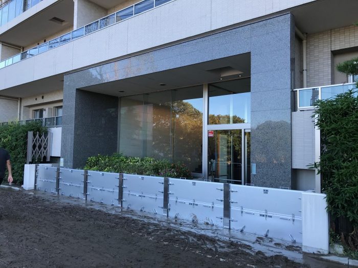 ▲写真 多摩川から水が溢れ出す前にエントランス前に設置された止水板 出典:Ⓒ高見貞夫