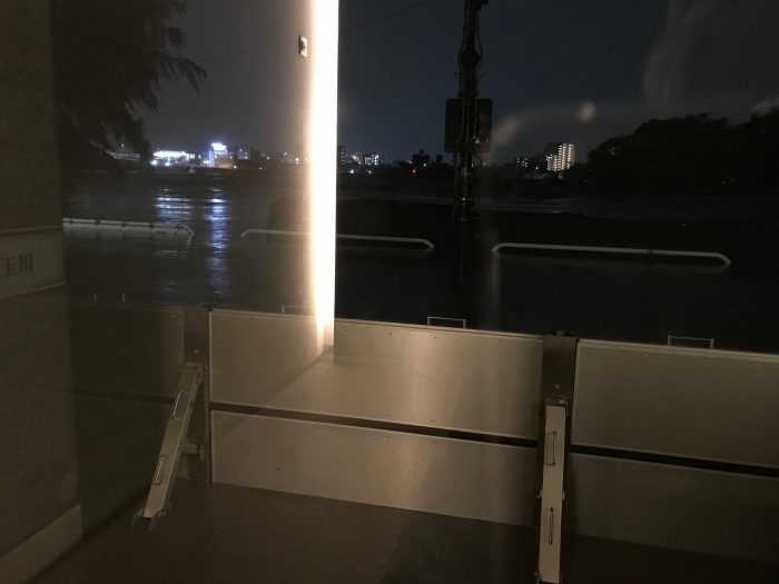写真から止水板が見事に川から溢れ出た水の浸入を防いだのがわかる。ちなみに近隣のマンションの道路より低い部分は冠水してしまっていた。無論、水位が1メートルを超してしまったら、水が建屋に流入してしまうわけだが、少なくとも今回浸水は防ぐことが出来たわけだ。