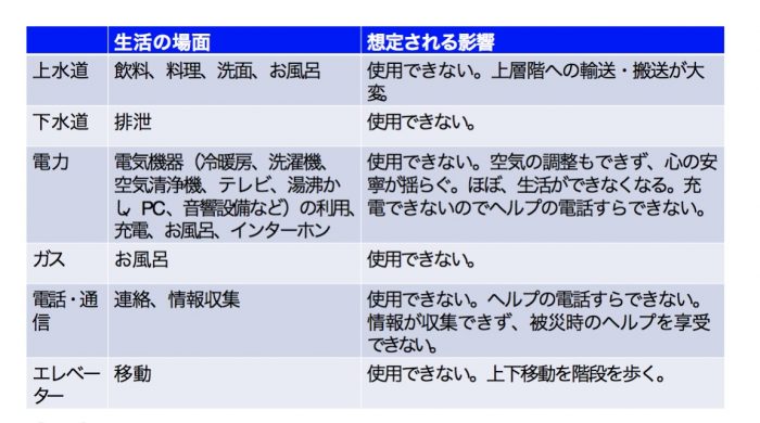 健常者でもそうなのだから、しょうがい者や介護を受けている方にとっては危機と言っても過言ではない。今回、電気が使えない場合ということは、タワマンのメリットでもある「セキュリティ」も機能しないということでもある。「快適」というメリットも状況によってデメリットに転化してしまうのだ。