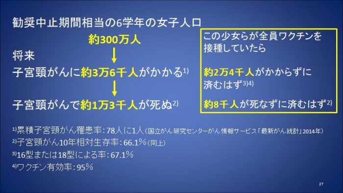 ここに衝撃的な推計がある。厚労省の勧奨差し控え期間相当の6学年の女子人口は約300万人、ワクチンを接種していれば防げた子宮頸がんに罹患する子宮頸がんで約1万3千人が死亡すると推定されているのだ。