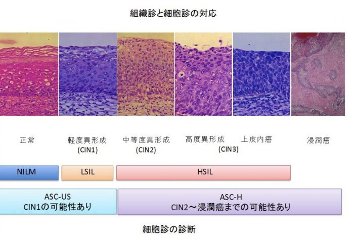 ▲写真 子宮頸癌はこの図のように異形成という前癌状態を経て上皮内癌となる。上皮内癌は出来上がったばかりの癌だが、数年放っておくと浸潤が始まり広がっていく。 出典)徳島大学大学院私学薬学研究部