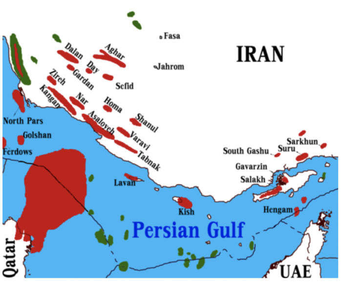 ▲画像 地図左の大きい赤部分がカタールのノースフィールドと隣接イランの南パース・ガス田