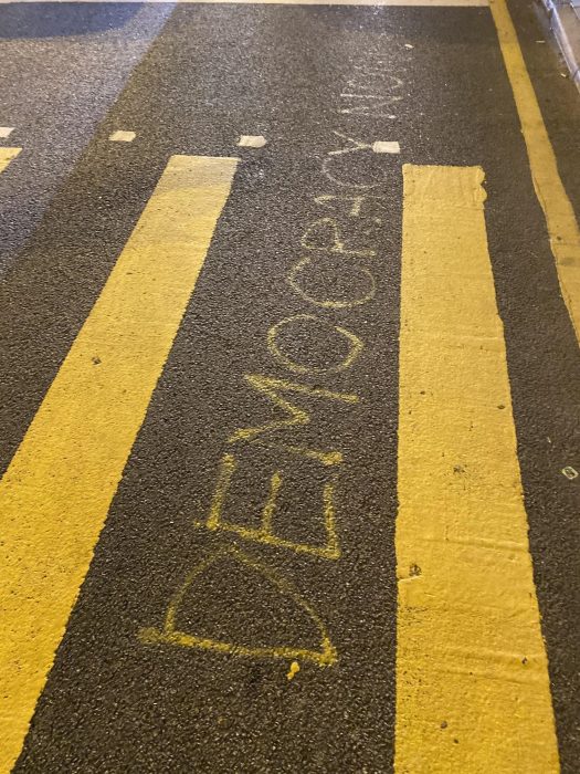 また、横断歩道にはスプレー缶で民主化を訴える生々しいメッセージも。
