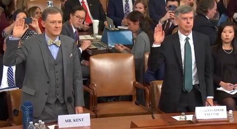 ▲画像 米下院情報委員会公聴会(2019年11月13日)で宣誓するジョージ・ケント氏(左)とウィリアム・テイラー氏(右)