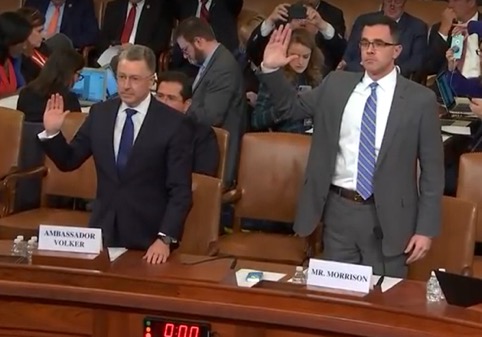 ▲画像 下院情報委員会の公聴会(2019年11月19日)で宣誓するカート・ヴォルカー氏(左)とティム・モリソン氏(右)